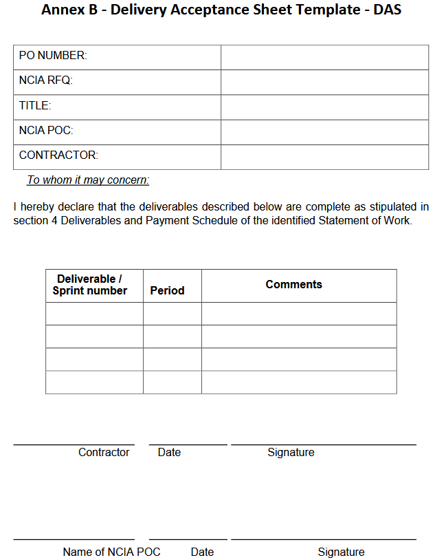 Invoices shall be accompanied with a Delivery Acceptance Sheet (Annex B) signed by the Contractor and the NCIA POC.