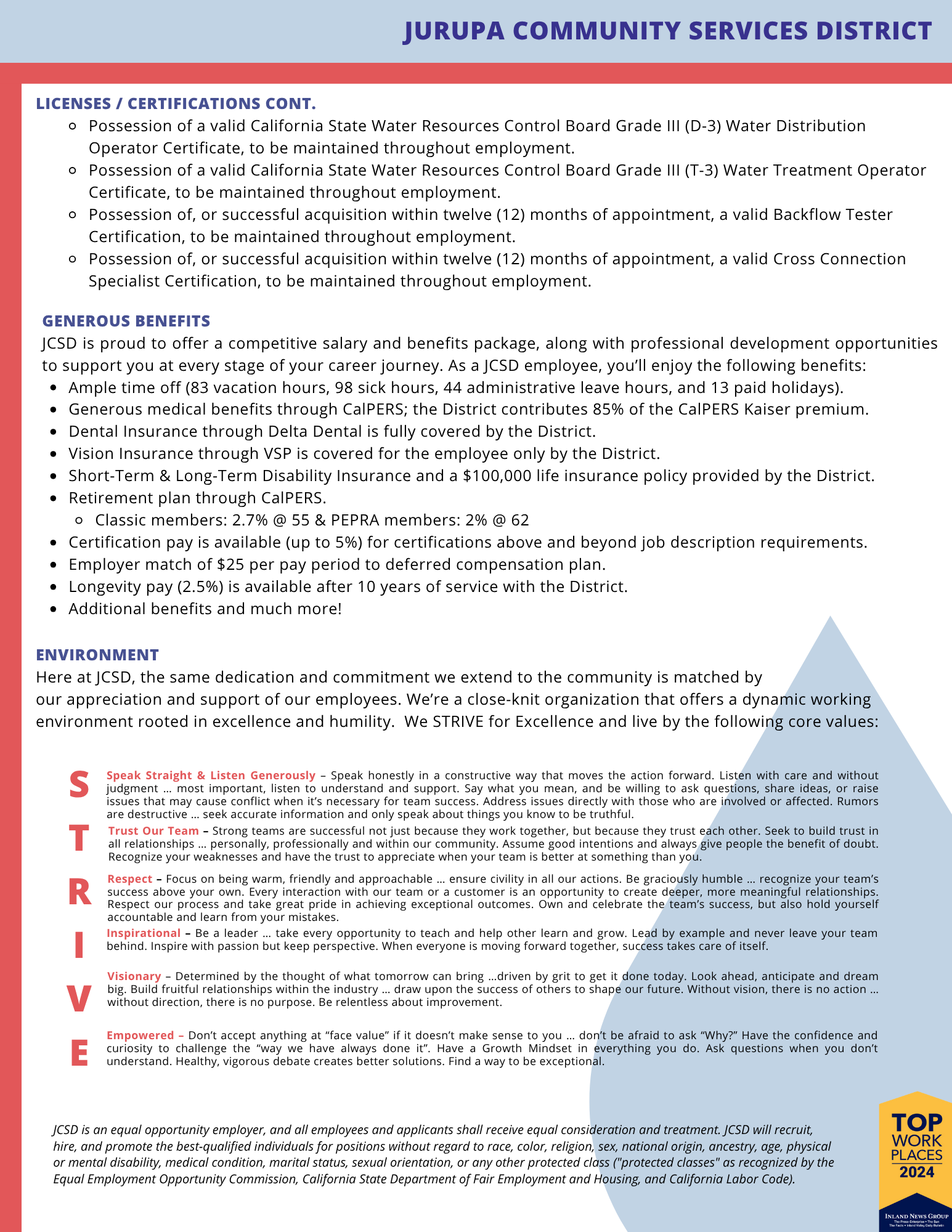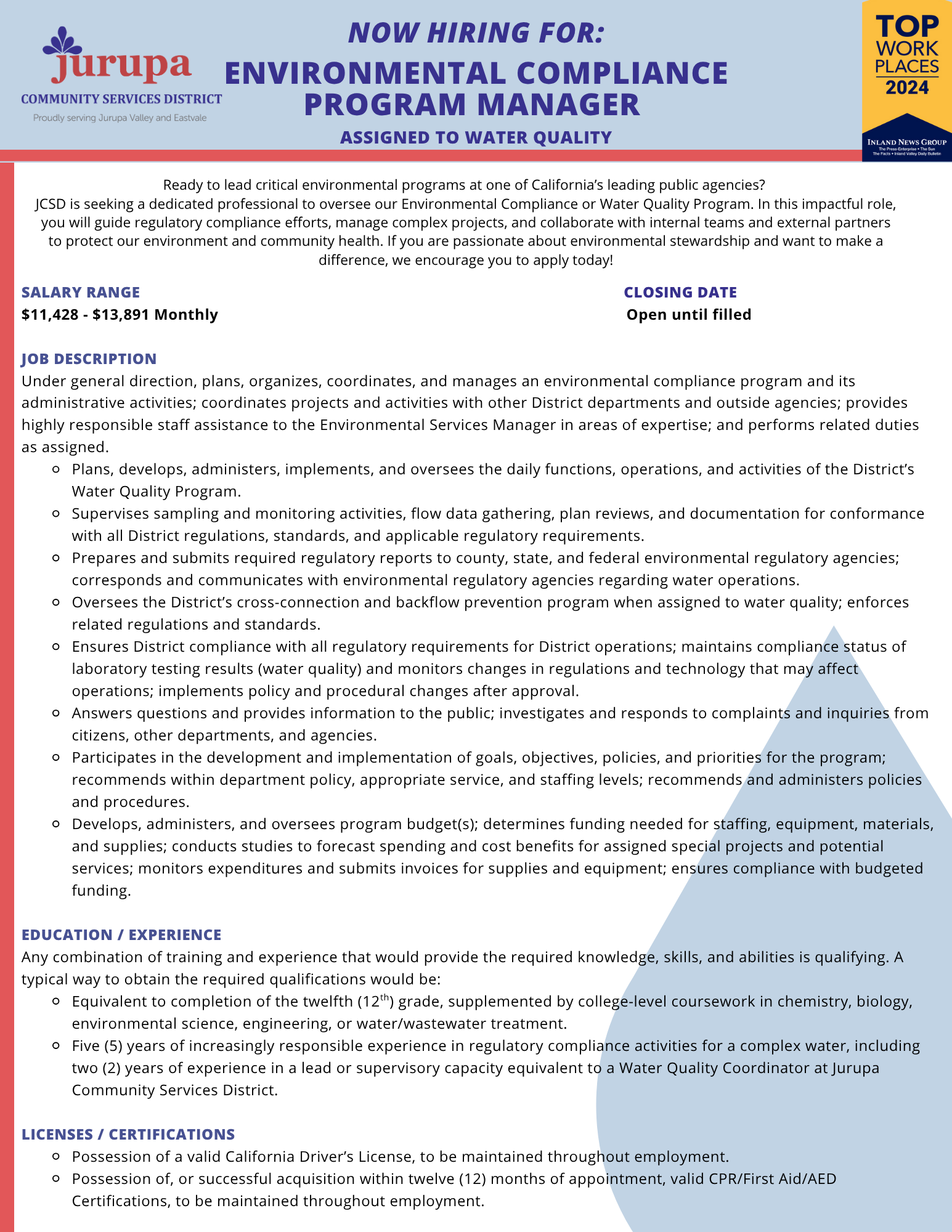 Environmental Compliance Program Manager - Assigned to Water Quality bei Jurupa Community Services District, CA