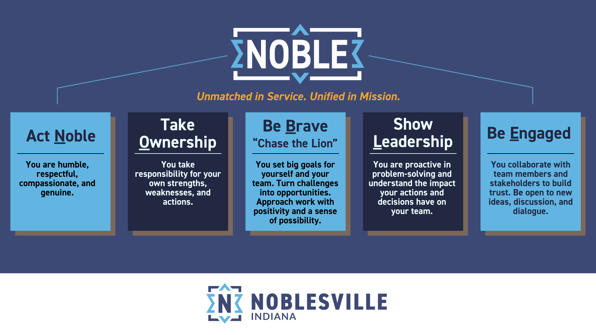 The culture initiative for city employees is NOBLE, "Unmatched in Service. Unified in Mission." It creates a professional environment that encourages individuals to live out their day-to-day work for the city by exemplifying NOBLE characteristics.