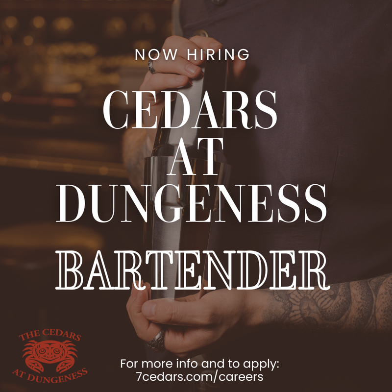 Cedars at Dungeness is now hiring a part-time Bartender to join our team. This is a tipped, evening shift position in a fast-paced environment. We’re looking for someone with strong bartending skills, a positive attitude, and the ability to provide outstanding service while keeping up with a busy atmosphere. If you thrive in a lively setting and enjoy creating a great guest experience, this is the perfect opportunity for you.The Bartender provides continuous quality entertainment, mixing and serving alcoholic and non-alcoholic beverages as well as food