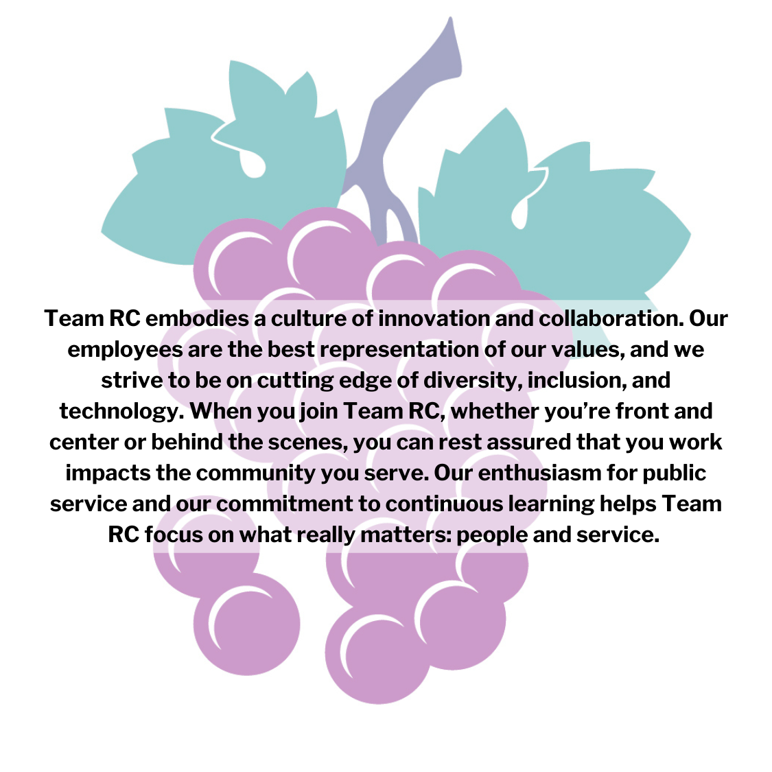 When you join Team RC, whether you're front-and-center or behind-the-scenes, you can rest assured that your work makes an impact in the community you serve. Our enthusiasm for public service and our commitment to continuous learning helps Team RC focus on what really matters.....service and people.
