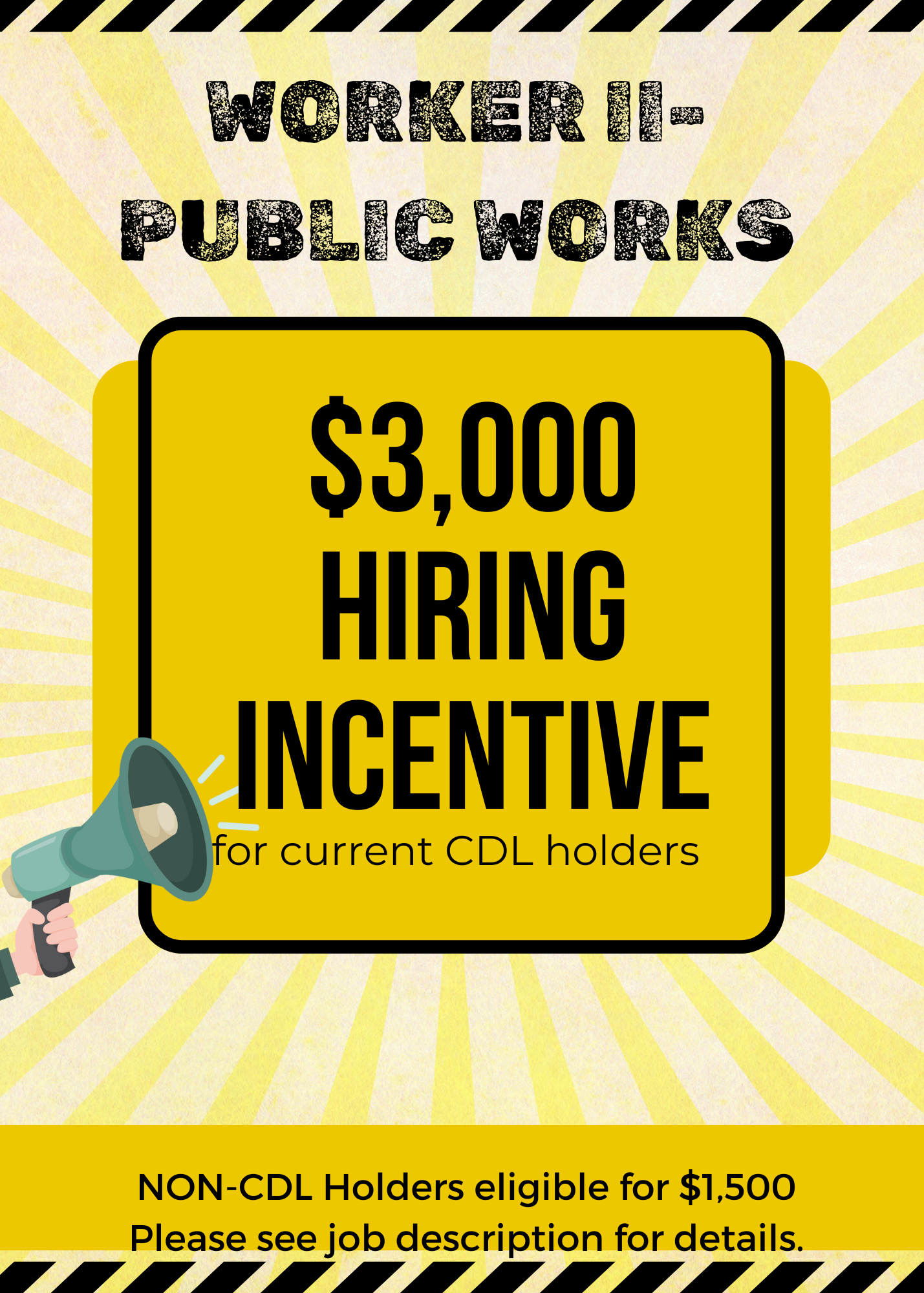 Valid Driver’s License: $1,500 one time hiring incentive to be paid in $500 increments (not added to base salary). This is a one-time incentive, and you will not be eligible for an additional incentive when you obtain your required CDL license.