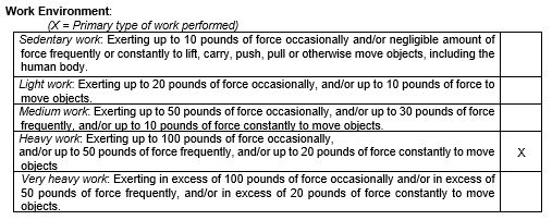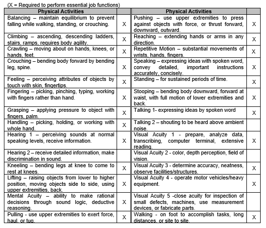- This work typically requires the following physical activities to be performed. A complete description of the activities below is available upon request from Human Resources.