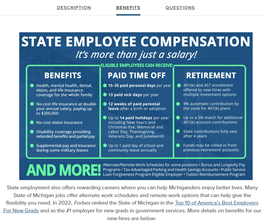 The State of Michigan has been recognized as a leading U.S. employer by new graduates from 2021-2023 and a best large U.S. and state employer. Recognized on the international stage for fostering positive employee engagement, the State of Michigan is a past recipient of a North America Government Agency Employees Engagement Award.