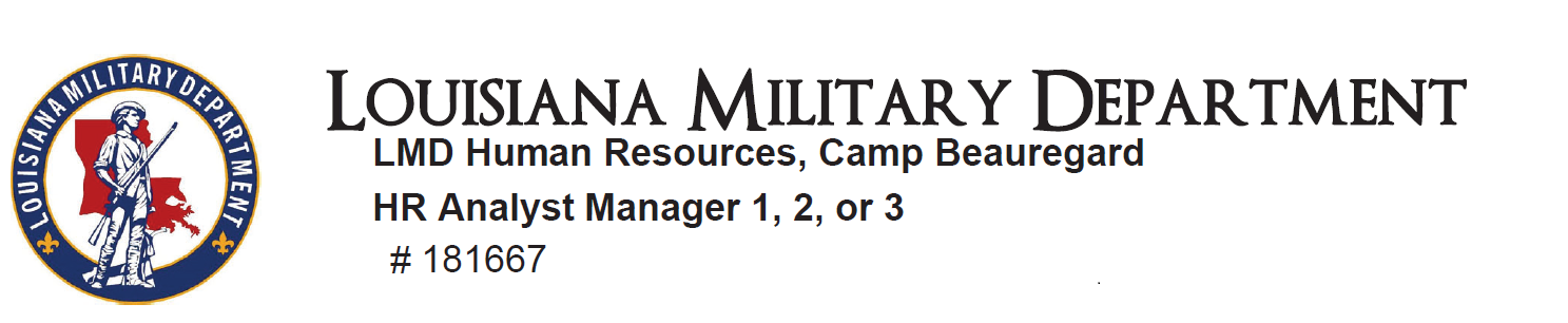 Performs duties as an HR Analyst and Manager for several employee with the Louisiana Military Department at Camp Beauregard (CB) and Camp Minden (CM). Assists Employee Administrator with Human Resources duties. Provides Human Resources to all employees including in processing, out processing and maintaining employee files in the State SAP System. Processes a full range of personnel and payroll actions needed to complete appointments, merit increases, promotions, transfers, separations, etc. Maintains personnel folders and files/maintains all employees' information into their folders. Computes routine pay changes and may compute service time of employees as required. Verifies accuracy of information and makes needed corrections. Provides general, basic explanation of employee benefit programs and advises employees of various options available under some programs. Reviews benefits documents for accuracy and completeness; forwards to appropriate office. Provides induction documents to new employees, provides guidance and a general overview of each document; follows up to ensure new employee timely completes all required forms. Enters and checks T&A's for Camp Beauregard’s time schedule (Wed-Friday Payroll week). Enters and checks changes of payroll - Time Schedule (Friday & Monday Payroll week). Enters and verifies Background/Drug screening results. Inputs and checks Merit Increases. Inputs changes for bank, address and any other personal information. Daily in processing and out processing of Camp Beauregard /Youth Challenge Program - Camp Beauregard (YCP-CB) employees. Reviews Form 1's and PER's. Run and manage CATS reports, time and attendance that is entered into CATS. Training the HR staff that reports to Camp Beauregard Pineville and Camp Minden. Maintain the K-time tracker doing all hazard events. Help organize activity with the Charitable contributions Campaign. Work and review the OGB Monitoring report each month. Inputs/processes all LMD-CB supply orders. Completes ISIS HR paid, transfers and separations, benefits & enrollment POC for CAC Card Processing. Complete Microsoft Office Courses. Complete Civil Service Training Courses. Complete HCM/ERP Courses: Basic Navigation, Employee Administration, Time Administration, Basic and Advanced Reporting, Introduction to ORG Management. Perform other duties as assigned.