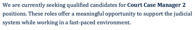 As a Court Case Manager 2, you will respond to inquiries in writing, in person, or by telephone from attorneys, litigants, court personnel, judges, and the general public.