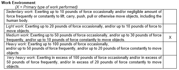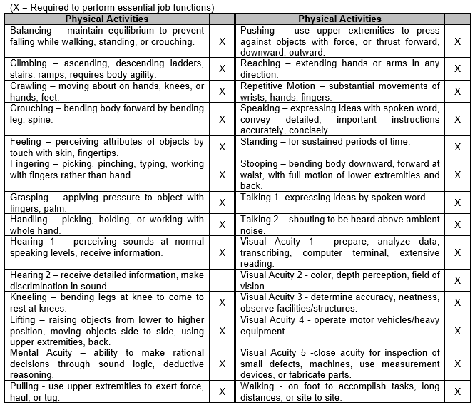 - This work typically requires the following physical activities to be performed. A complete description of the activities below is available upon request from Human Resources.
