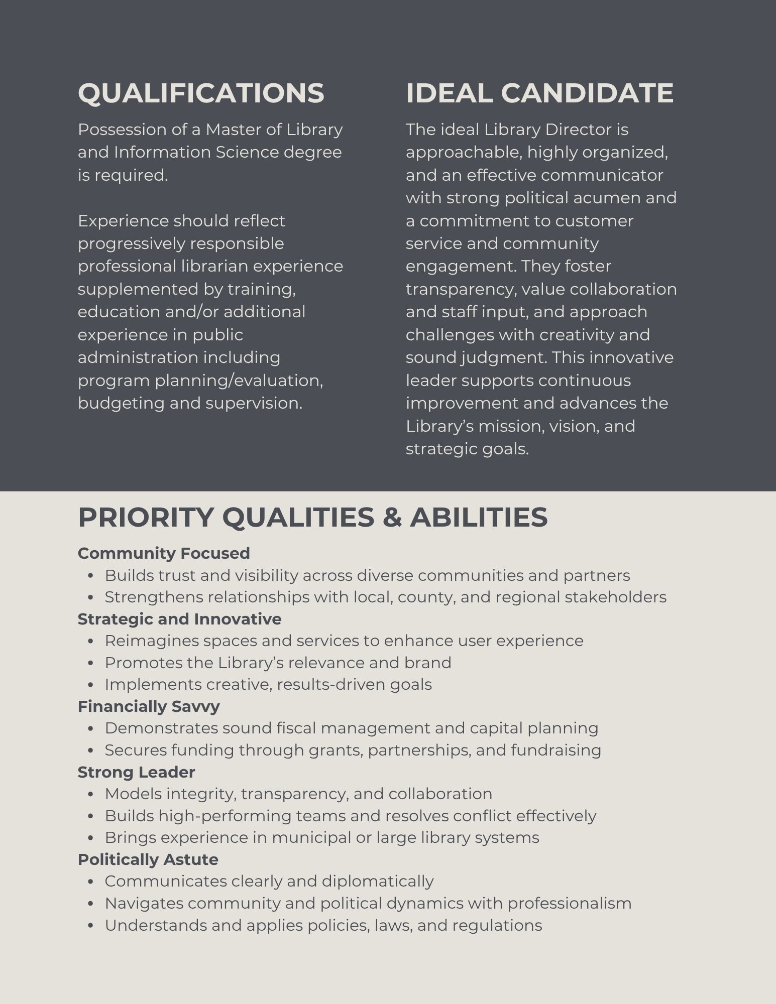 A Master’s degree in Library Science or Library and Information Science is required for this position. All candidates are strongly encouraged to submit a copy of their college diploma (verifying the degree, date earned and area of specialization) or official/unofficial transcripts (verifying institution, student, date, degree and area of specialization conferred) by the final filing date.