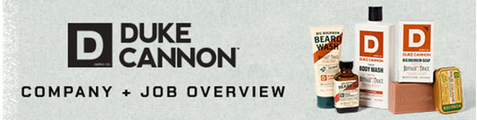Duke Cannon Supply Co. offers a fast-paced environment where decisions are vetted quickly, and opportunities are relentlessly pursued. We work hard, but we value flexibility as well. We have an informal culture with an emphasis on having fun (we sell soap, after all), though we have the most fun when we exceed our goals. The company’s leaders are dedicated to the growth and development of the team; as such, we want to ensure that our people have a rich and rewarding experience with unique opportunities to grow.