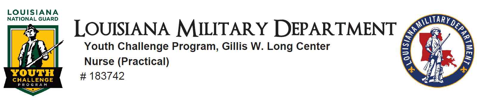 Deal directly with cadets’ parents/guardians concerning physical/ mental problems and find solutions in dealing with the cadet to ensure their wellbeing. Counsel cadets that may be experiencing problems due to illness or injury. Work with the staff of the Youth Challenge Program (Cadre, Counselors, and Instructors) communicating medical conditions, limitations and capabilities of cadets. Transport cadets to outside appointments using state vehicles, including emergency trips as required. Participate with Registered Nurse in classroom teaching of Core Components for which Medical Dispensary is responsible. Conducts special testing (drug, pregnancy, urine) for Medical Director as directed. Responsible for sick call as assigned, using Standing Orders to triage cadets and communicate problems and/or situations with Medical Director, parents/guardians, and other staff as needed. Responsible for documentation of medical conditions and telephone communication in the medical chart. Coordinate/package prescription refills with pharmacy, providers, and parents/guardians. Document medications given at pill calls. Maintain accurate count of Control 2 medications. Prepare monthly medication record. Secure all medication areas (carts, cabinet, doors) when not in use. Ensure that all medical practices are in accordance with the Nurse Practice Act and maintain confidentiality of cadet medical information. Perform other duties as assigned.